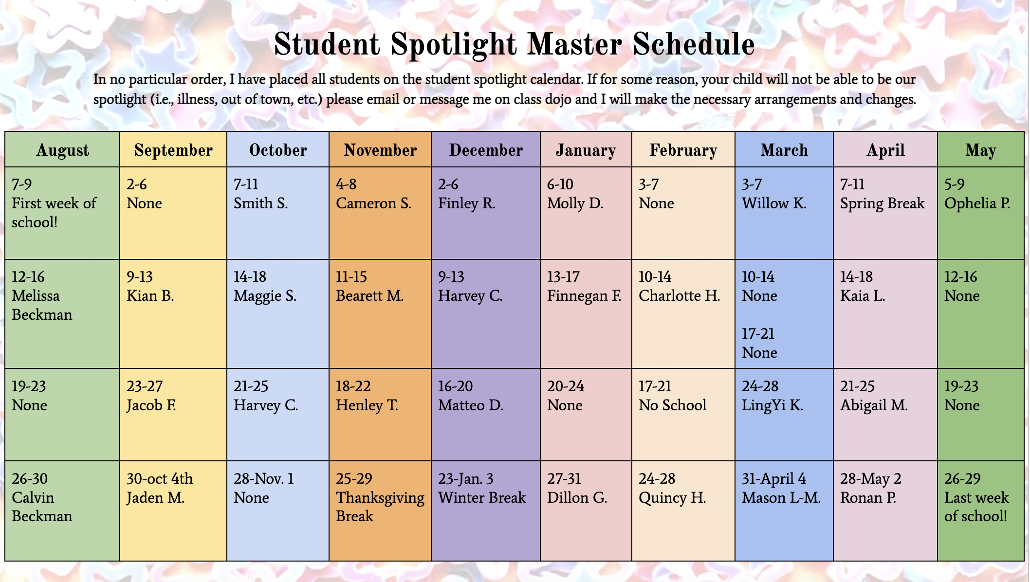 First, do not worry. Most of the special spotlight moments and activities are already integrated in the classroom. However, there are a few things that I will need from you.